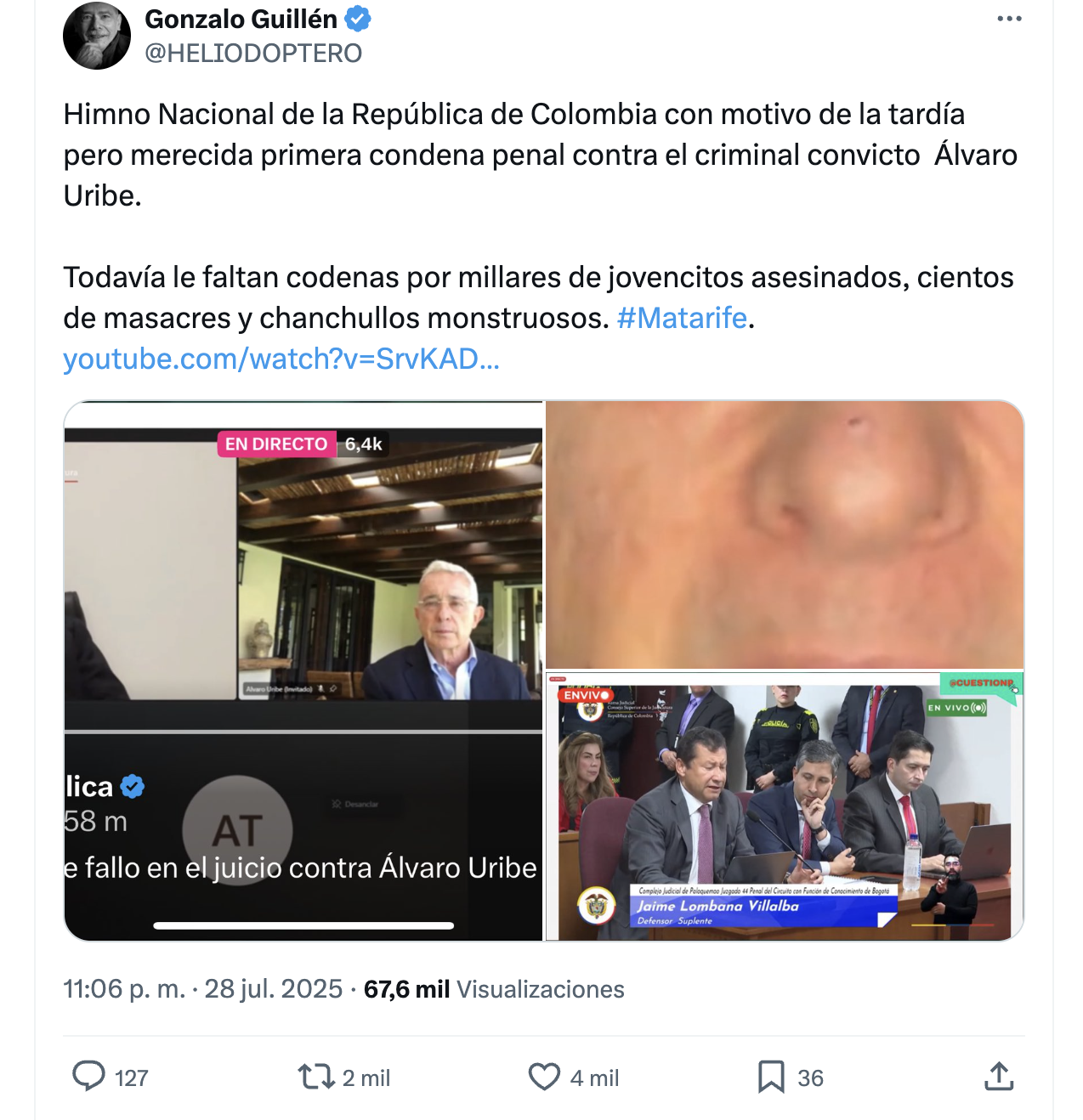 “Himno Nacional de la República de Colombia con motivo de la tardía pero merecida primera condena penal contra el criminal convicto Álvaro Uribe”, escribió Guillén, acompañando su publicación con un video en el que se escucha el himno nacional y diversas capturas del juicio transmitido en vivo.