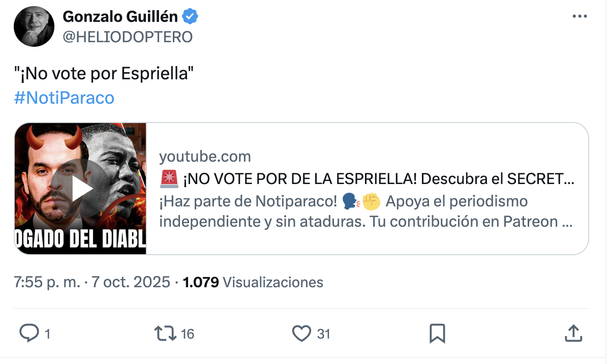 El periodista Gonzalo Guillén volvió a sacudir las redes sociales este martes 7 de octubre con un mensaje directo y sin rodeos: “¡No vote por Espriella!”, acompañado del hashtag #NotiParaco y un enlace a un video en YouTube del espacio satírico Notiparaco.