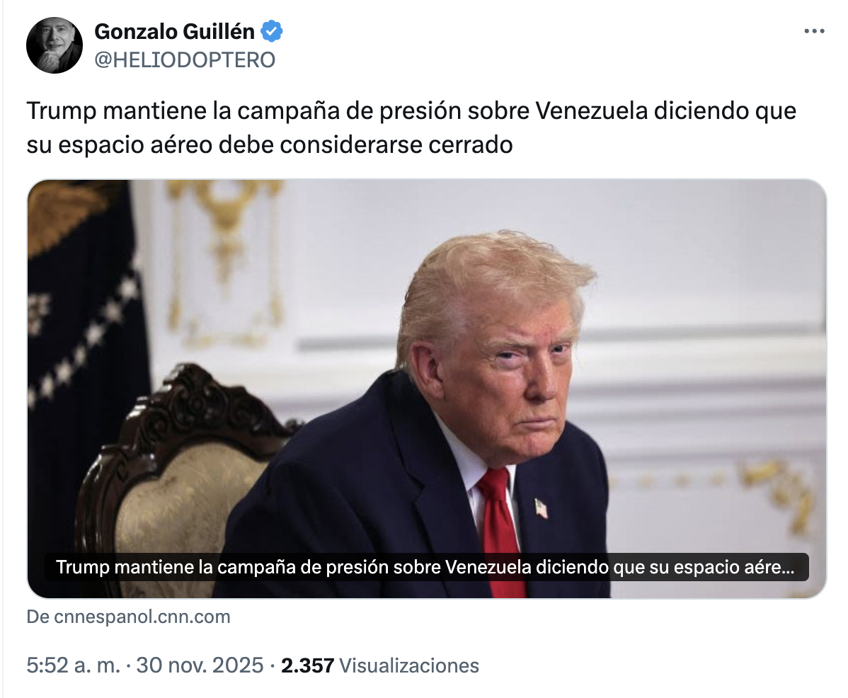 “Por favor, consideren que el espacio aéreo sobre Venezuela y sus alrededores está completamente cerrado”, escribió en una publicación de Truth Social.